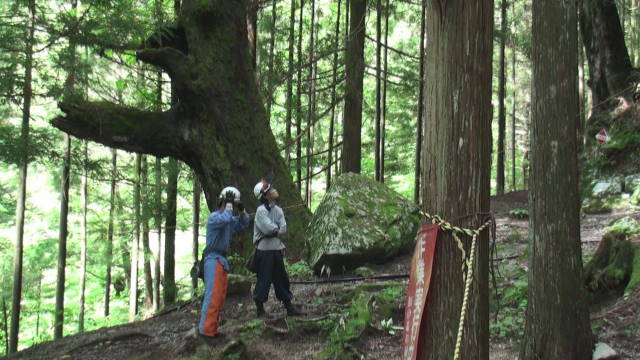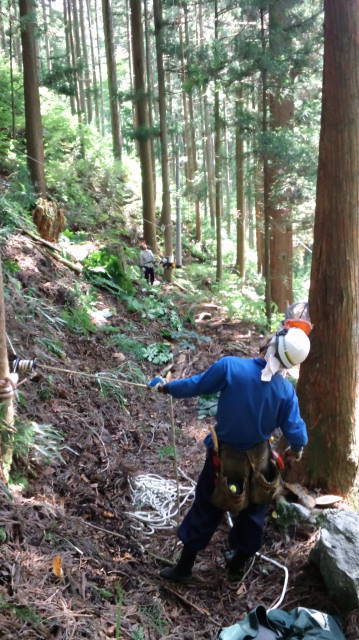 ・飯伊森林組合ではグランドワーカーとクライマーがお互いに役割を十分に認識し、お互いに大きな声で合図や確認を行うことで事故を未然に防ぎます。